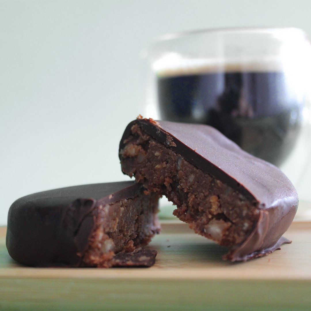 Un ponquesito individual griego cubierto de chocolate crujiente y con relleno de crema de café.
