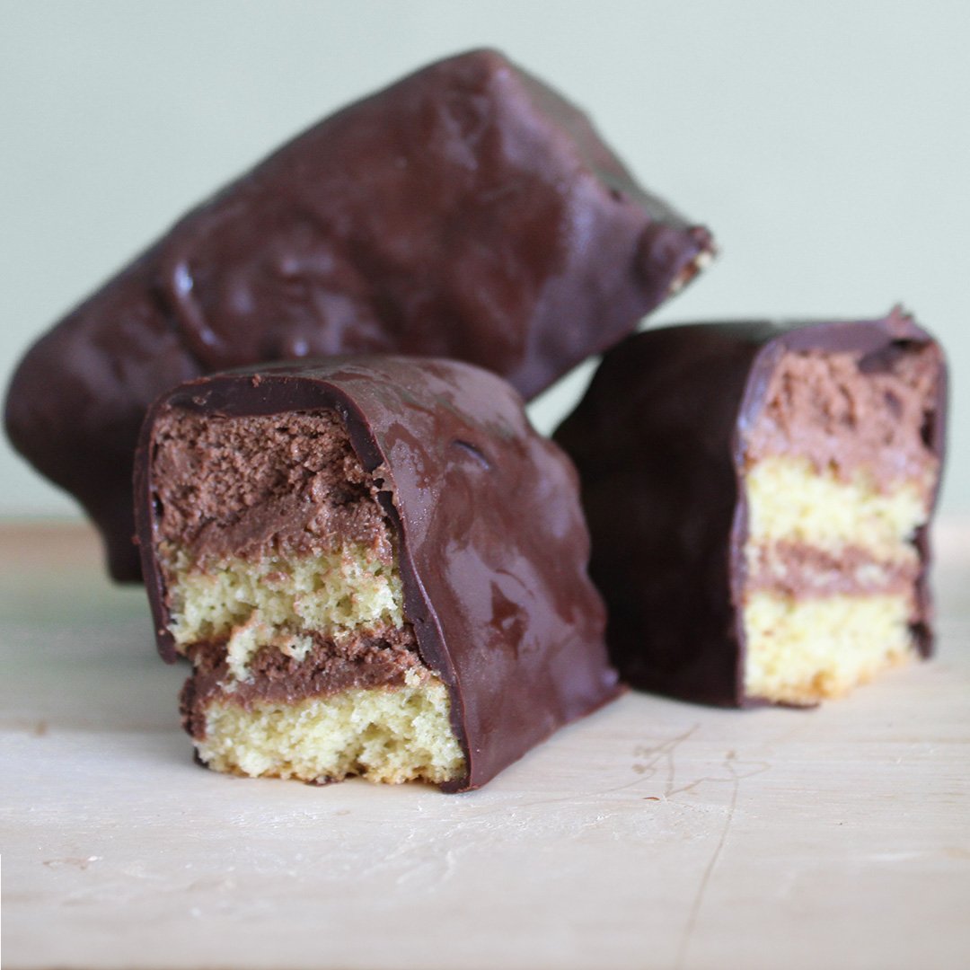 Un ponquesito individual griego cubierto de chocolate crujiente y con relleno de crema de chocolate.