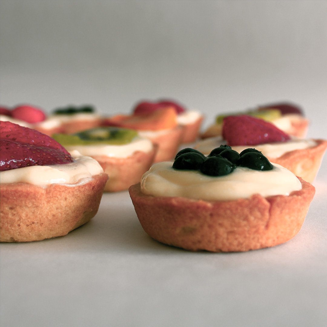 Una explosión de sabores inspirada en el estilo griego, con una base de galleta rica en mantequilla, cremosa crema pastelera y una variedad de frutas frescas